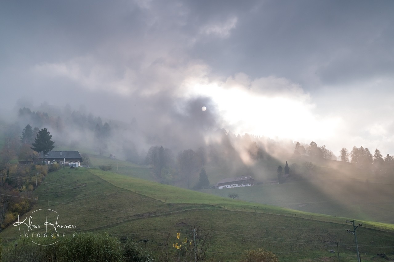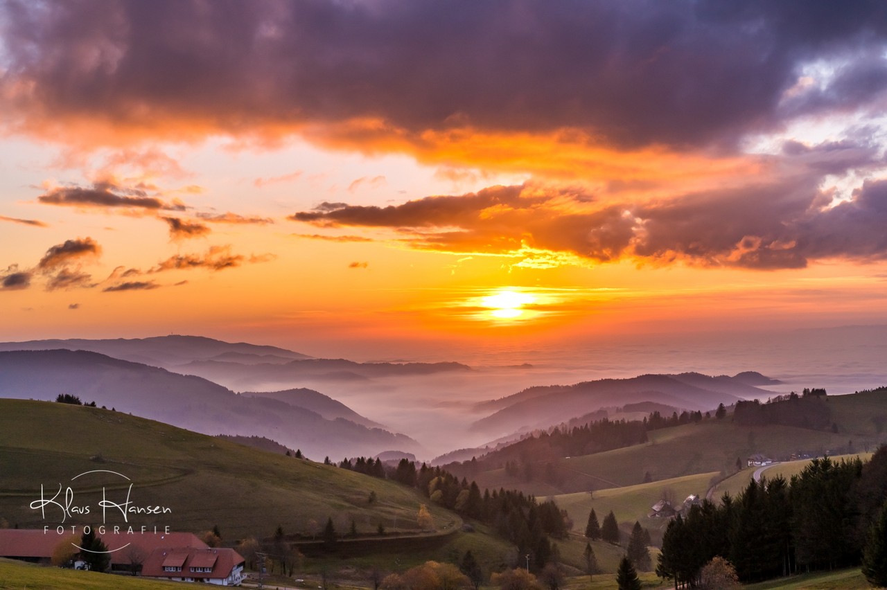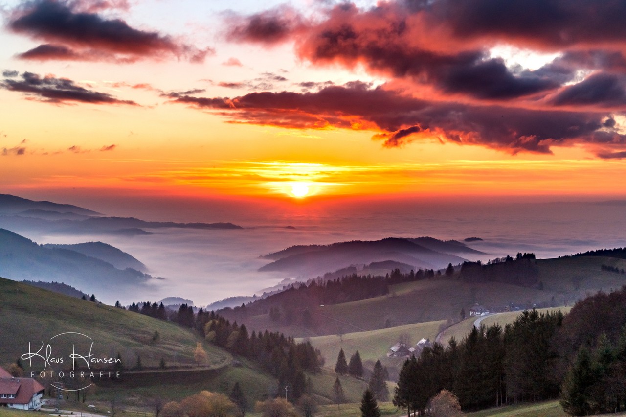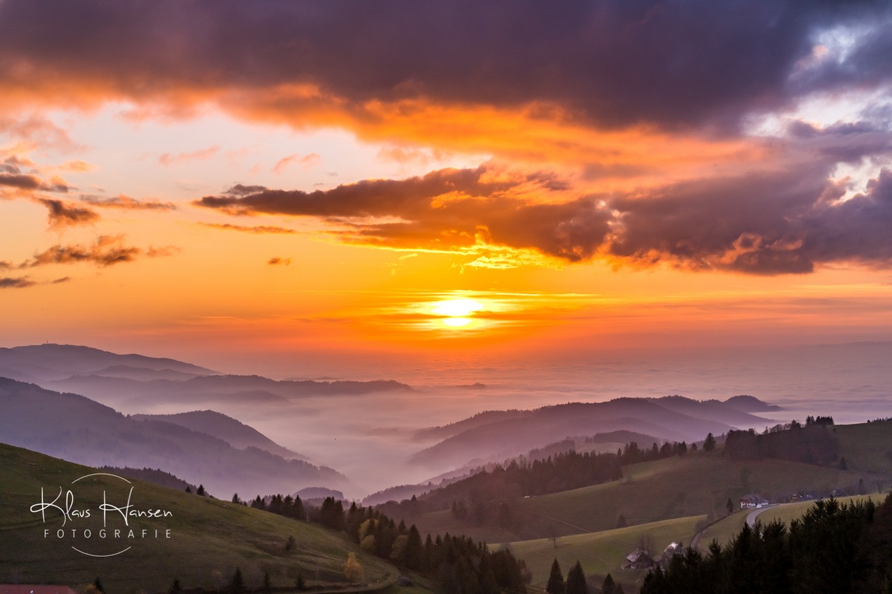 Das Münstertal Blick vom Köpfle St. Trudpert und Schauinsland an einem Tag. Im Nebel unten und oben der Sonnenuntergang über dem Wolkenmeer