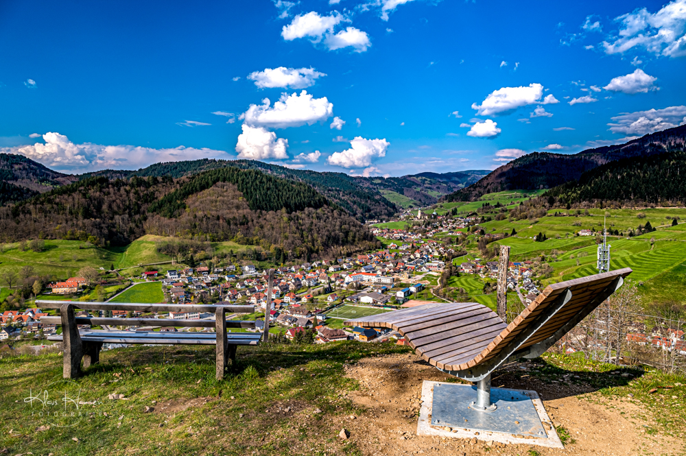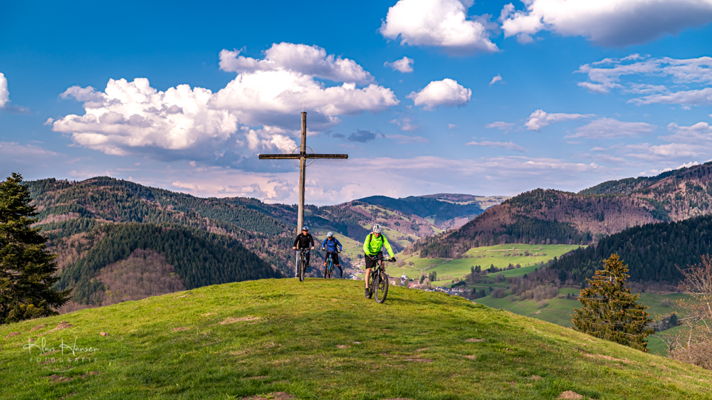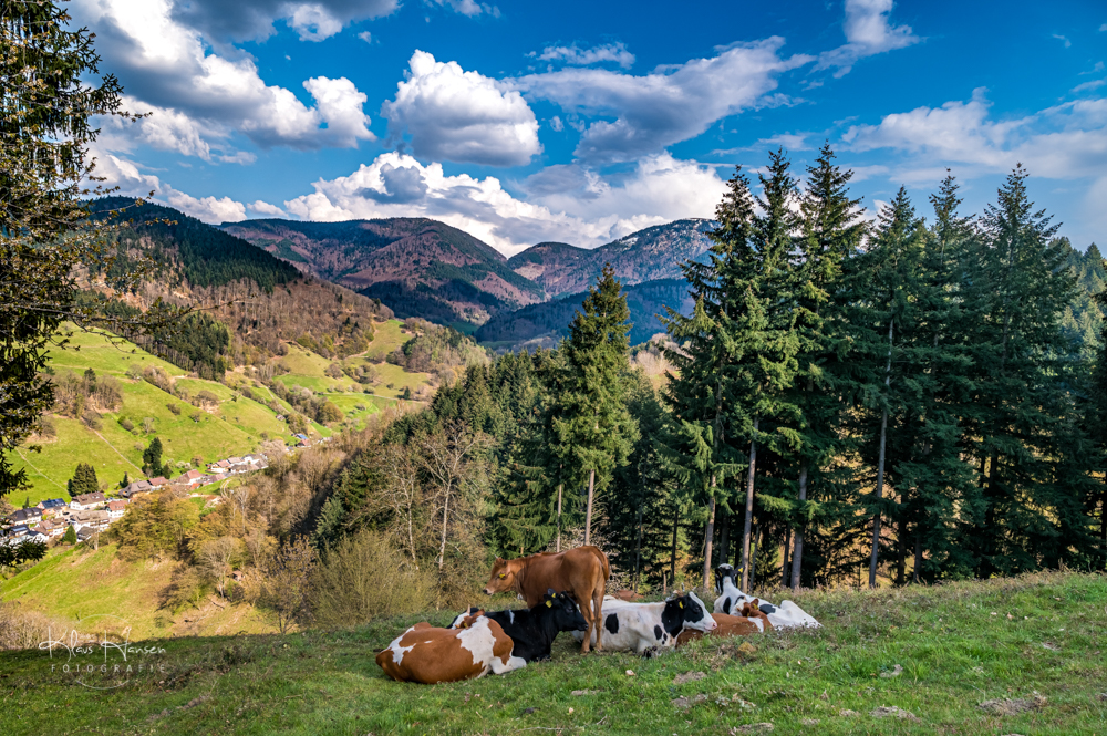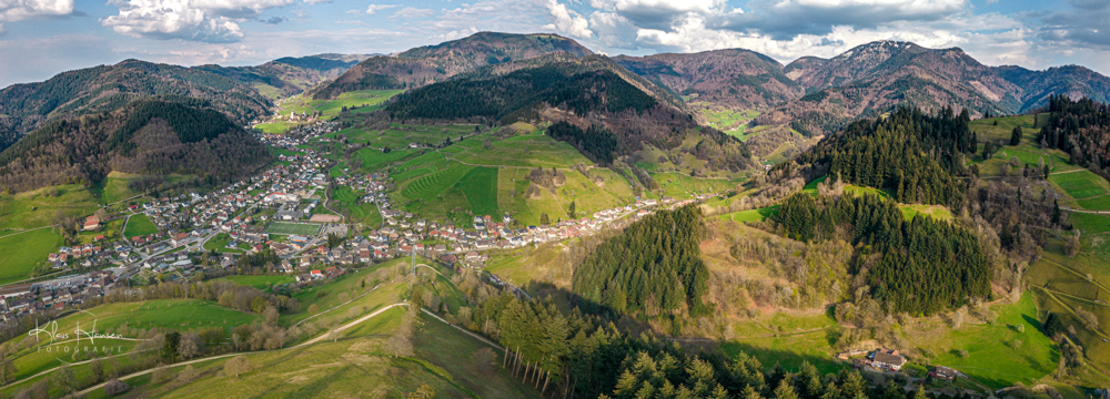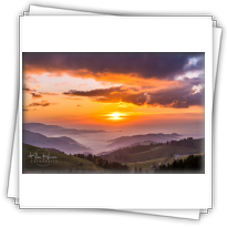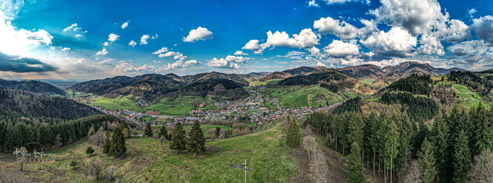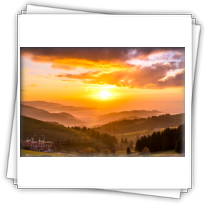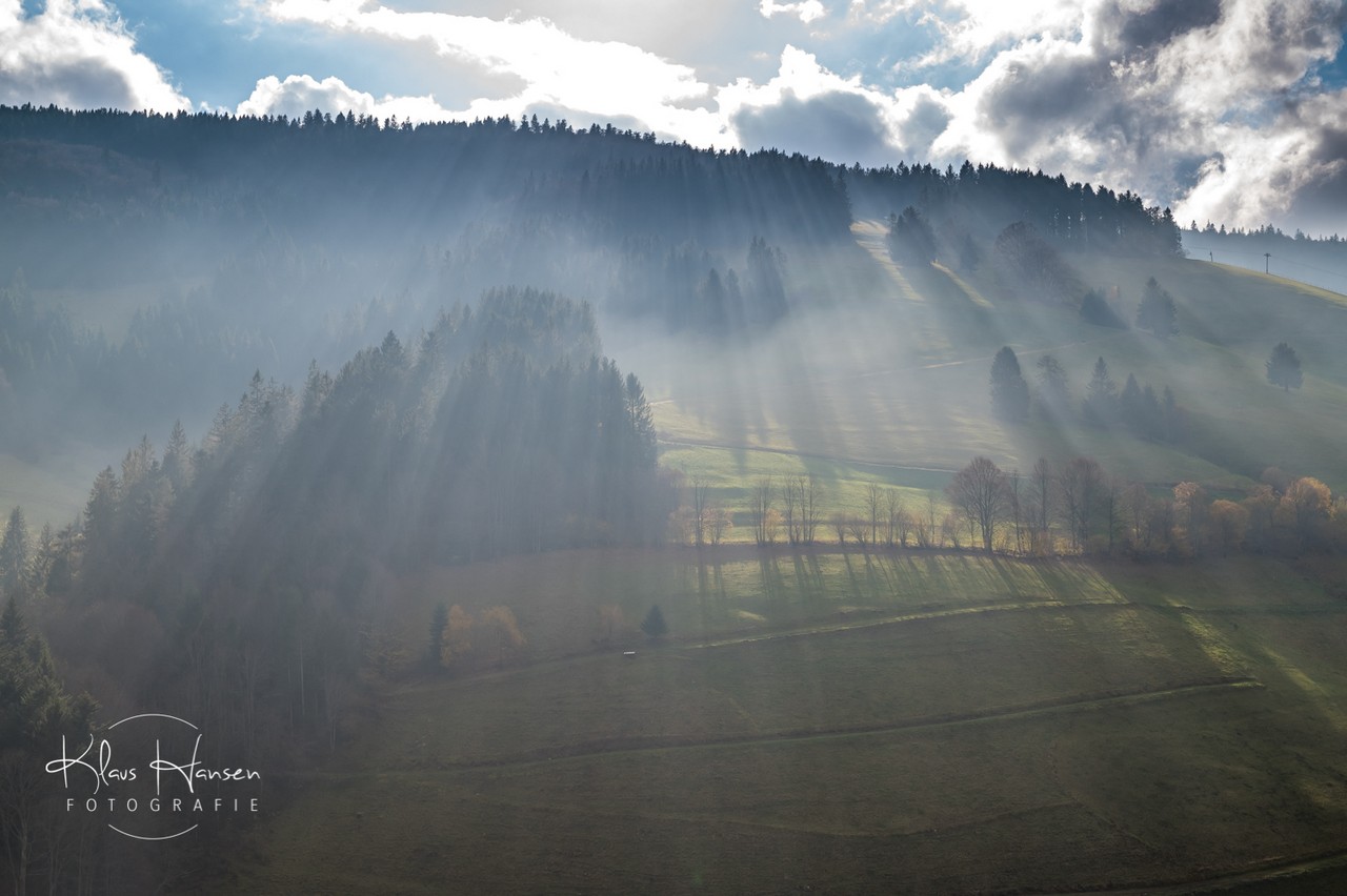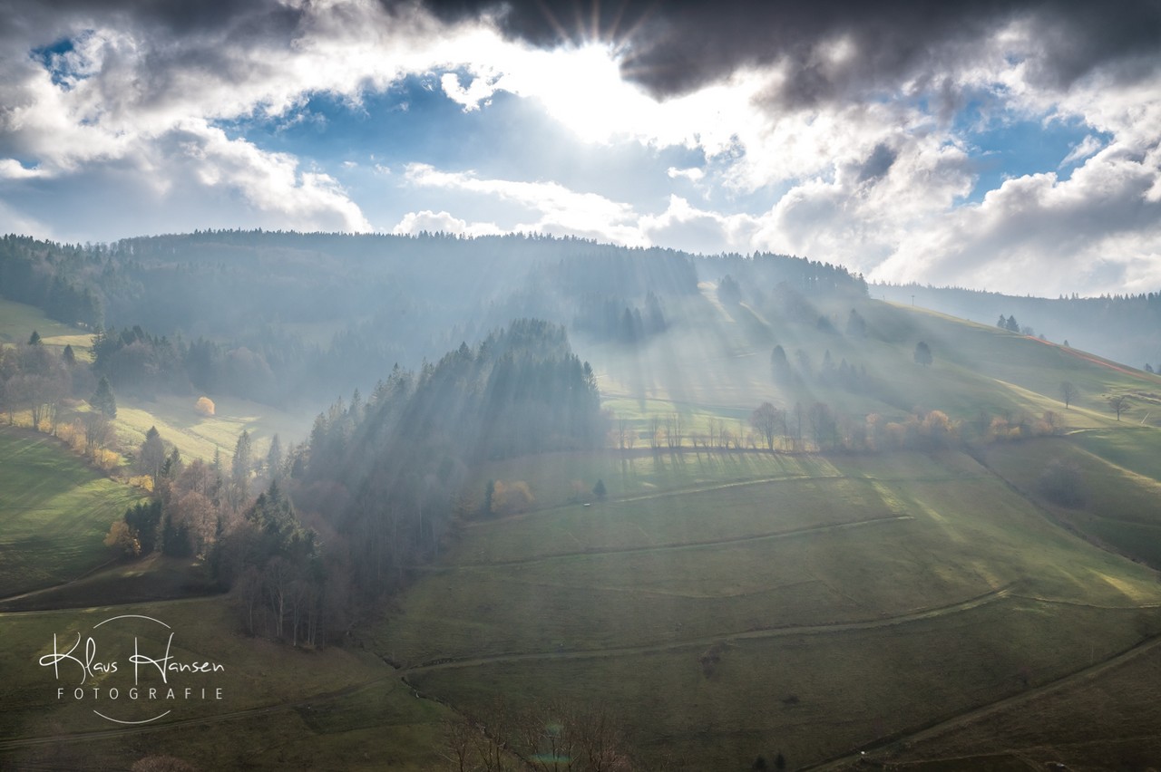 Das Münstertal Blick vom Köpfle St. Trudpert und Schauinsland an einem Tag. Im Nebel unten und oben der Sonnenuntergang über dem Wolkenmeer